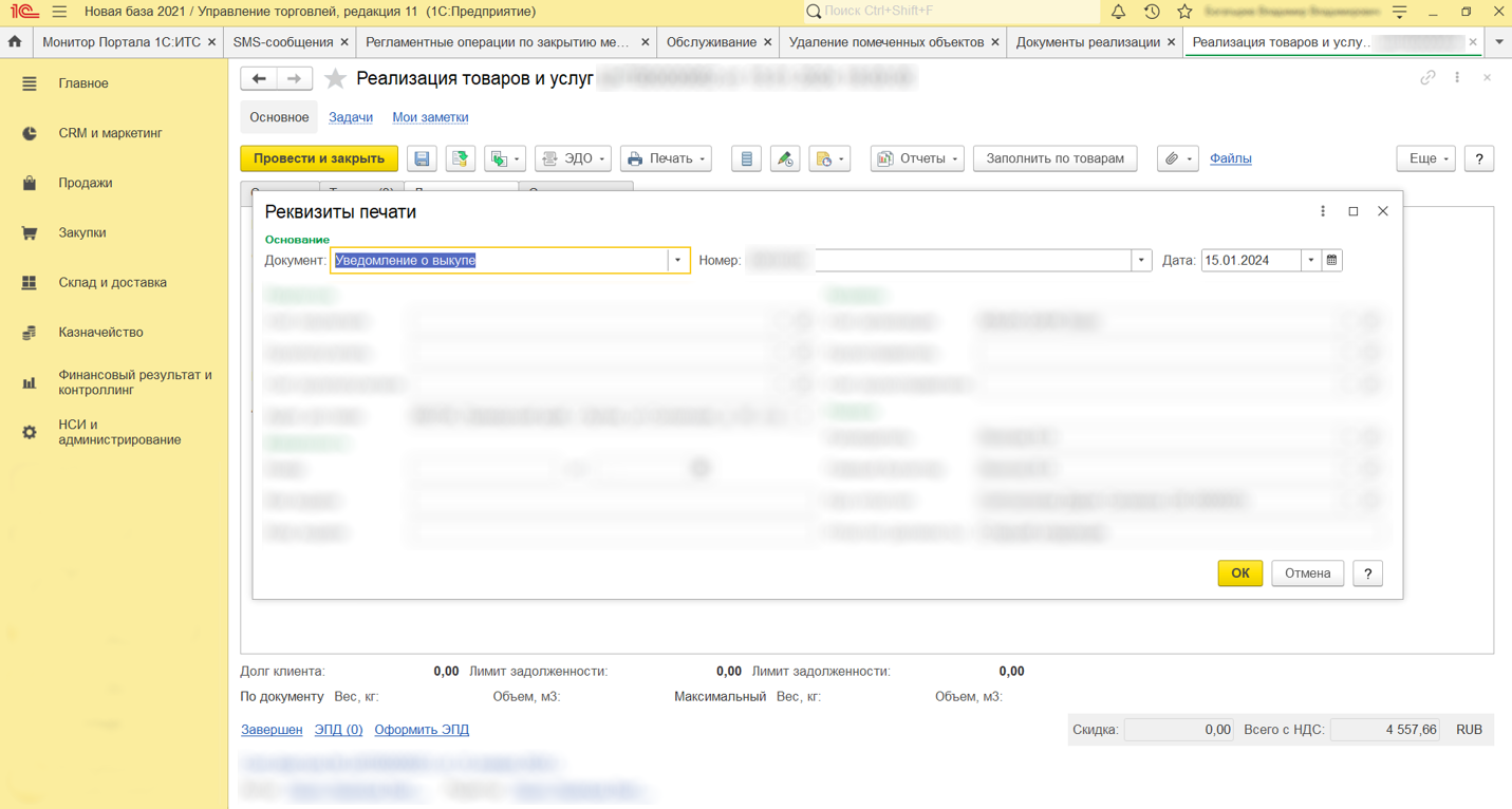 Для этого требуется перейти в документ «Реализация товаров и услуг», вкладка «Дополнительно», выбрать гиперссылку «Реквизиты печати» и заполнить блок «основание».